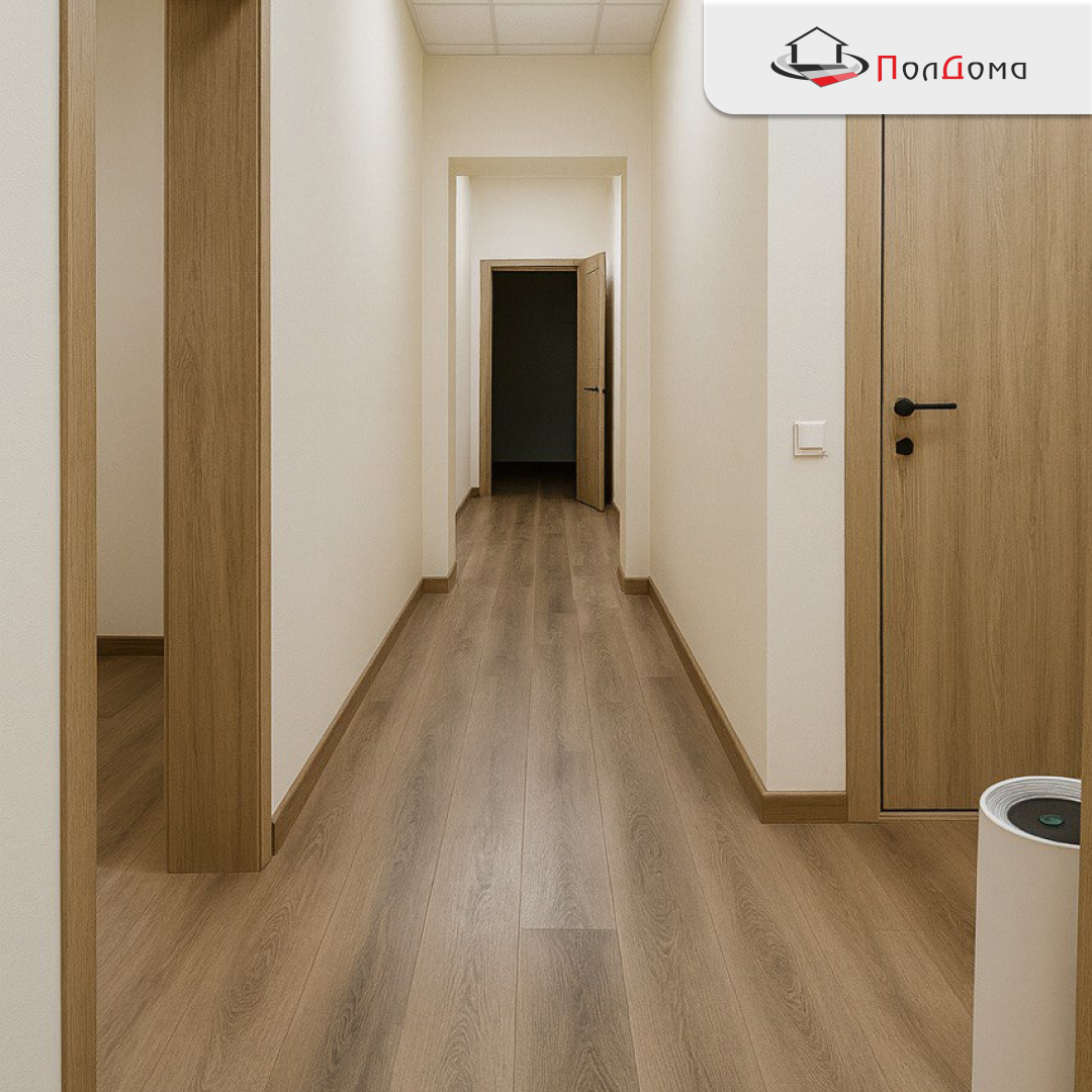 Для покрытия выбрана клеевая LVT Alpine Floor Grand Sequoia толщиной 2,5 мм — коллекция с выразительной «деревянной» фактурой, устойчивостью к истиранию и стабильной геометрией. По периметру смонтирован плинтус Arbiton Indo 11 для аккуратного примыкания к стенам и завершённого вида интерьера.